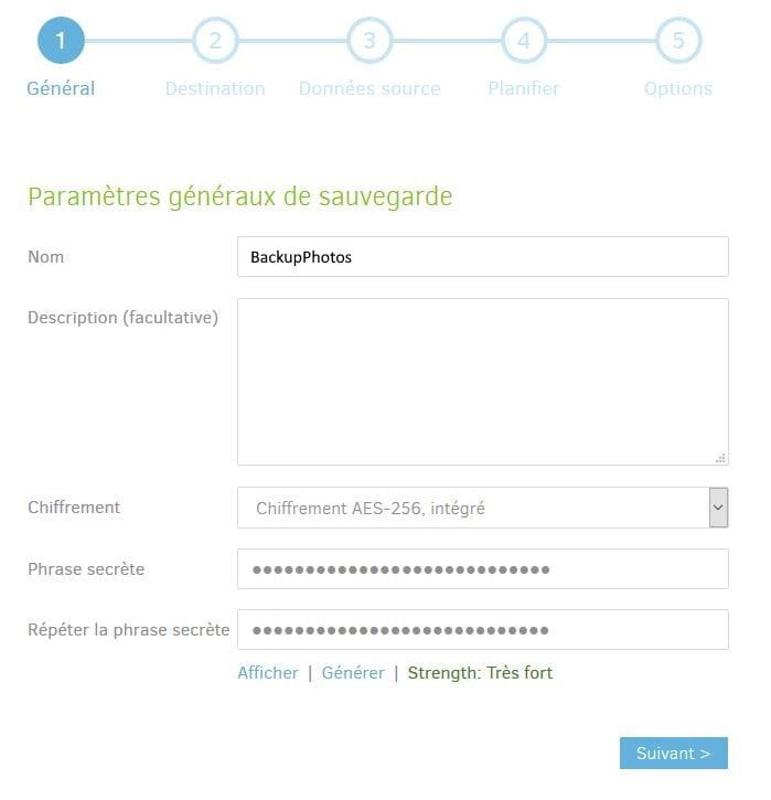 Dans l'interface de Duplicati, ajoutez une nouvelle sauvegarde puis renseignez un nom dans le champ correspondant. Sélectionnez Chiffrement AES-256, intégré, puis entrez une phrase secrète complexe. Conservez bien cette phrase dans un coin de votre tête ou, mieux encore, dans un gestionnaire de mots de passe. Cliquez ensuite sur Suivant.