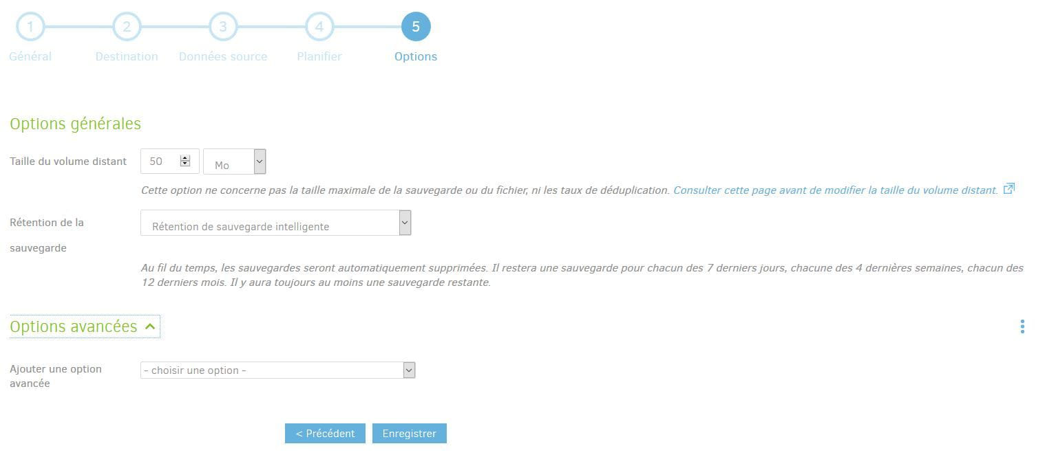 Et pour finir, sélectionnez rétention de sauvegarde intelligente. Comme mentionné dans l’interface de Duplicati, cela permet de conserver un certain nombre de backups. Terminez la configuration de votre sauvegarde en l’enregistrant.