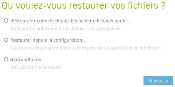 Cliquez tout d’abord sur Restaurer dans le menu latéral puis sélectionnez la sauvegarde qui contient le ou les fichiers à restaurer avant de cliquer sur Suivant.