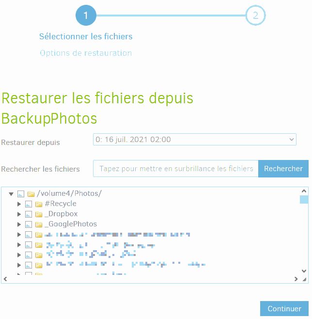 Choisissez dans la liste déroulante la date des fichiers que vous souhaitez récupérer puis sélectionnez le(s) fichier(s) et/ou le(s) dossier(s) et cliquez sur Continuer.