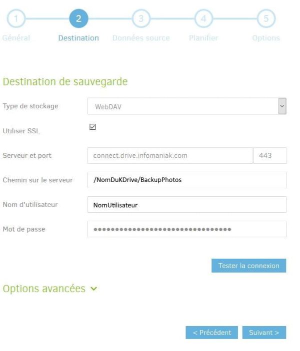 Dans cette deuxième étape, sélectionnez WebDAV comme protocole dans type de stockage et précisez que vous souhaitez utiliser le protocole SSL. Le serveur kDrive d’Infomaniak est connect.drive.infomaniak.com sur le port 443. Pour le chemin sur le serveur, indiquez le nom de votre espace de stockage que vous avez saisi lors de la souscription de l’offre kDrive et le nom du dossier dans lequel vous souhaitez mettre vos sauvegardes. Faites de même pour le nom d’utilisateur et le mot de passe (généré spécialement pour la connexion WebDAV depuis l'interface d'Infomaniak). Vous avez ensuite la possibilité de tester la connexion avant de cliquer sur Suivant.