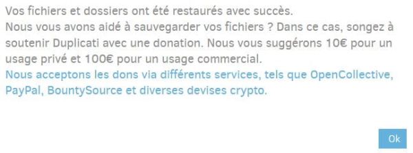 Plus qu’à cliquer sur Ok. Duplicati vous propose également de faire un don.